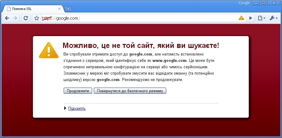 При заходженні на https://google.com, Хром видає наступне повідомлення: