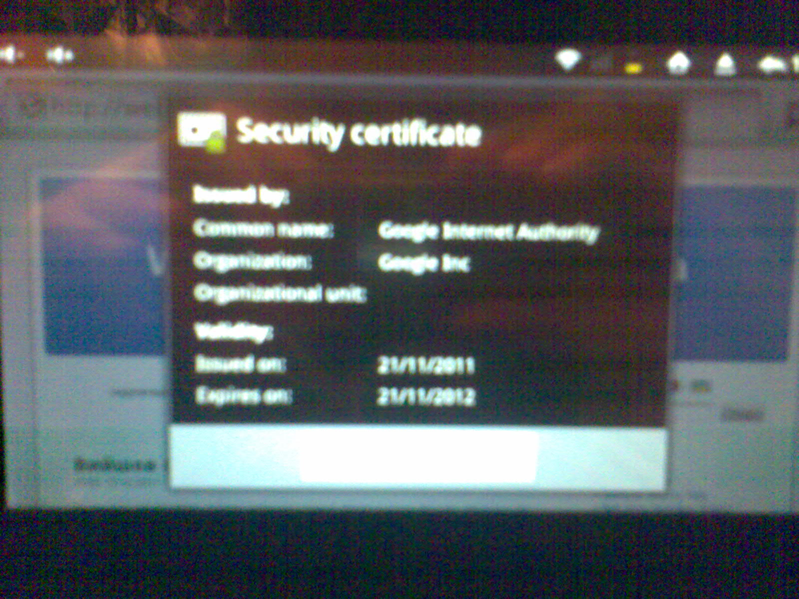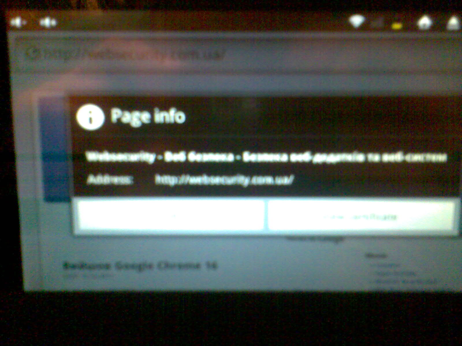 17:28 21.12.2011У грудні, 10.12.2011, я знайшов Certificate Spoofing уразливість в браузері Google Chrome для Android. Яку я виявив на своєму планшеті з Android 2.3.3. Про що вже сповістив розробників.